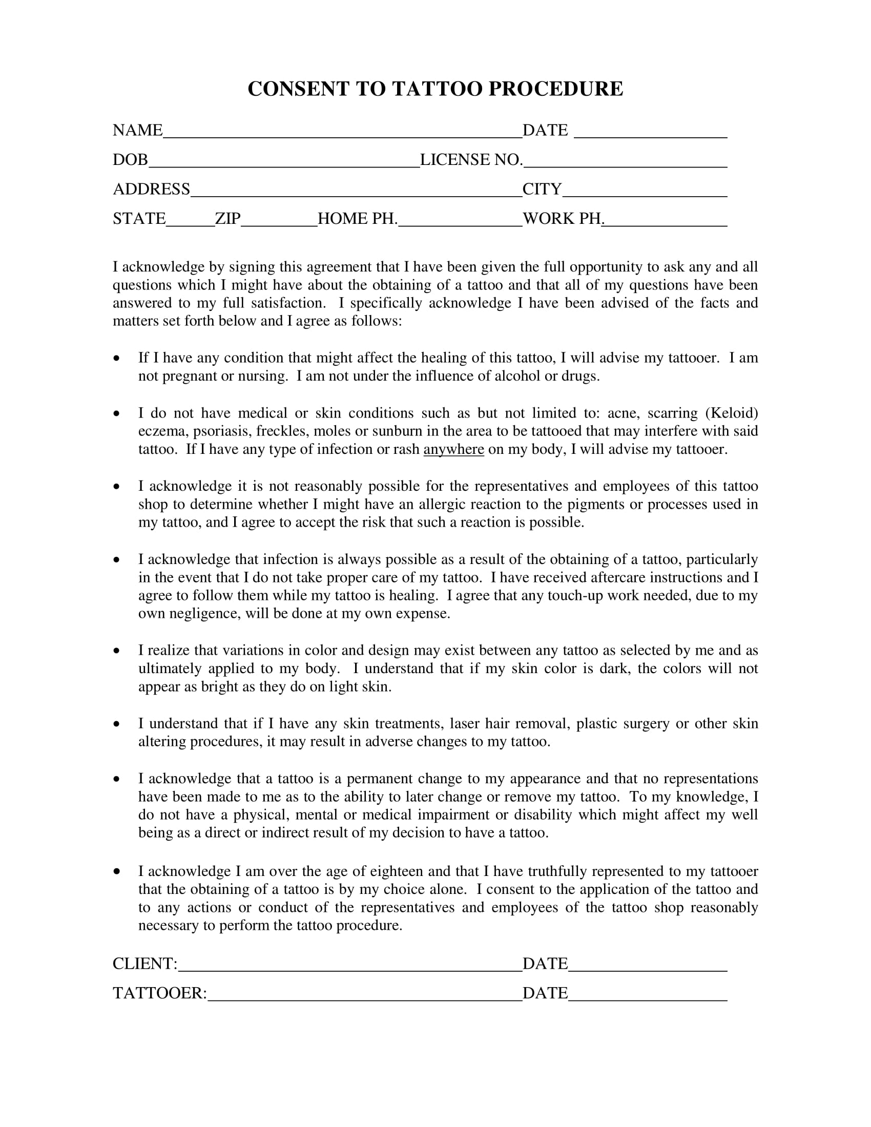 Beneath the skin tattoo reserves the right to refuse service to . Ordinances make it unlawful for any person to administer a tattoo or body piercing to . Tattoo/body piercing consent form understand that saint louis county : In the state of kentucky, in order for tattoos and piercings to be performed on minors, consent forms are necessary for the parents to sign and have . A tattoo and body piercing consent form allows an artist or piercer freedom from legal and financial liability if an unforeseen accident should take place .